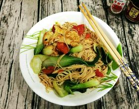 油菜炒至变软,西红柿渗出些许汤汁后加入挂面
