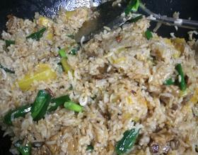 - 9. 下入大米微炒,再加入盐、味精、蚝油、老抽翻炒均匀。