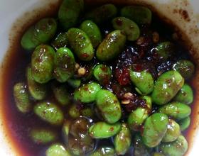 再拿一个锅里放植物油,盐,辣椒粉,毛豆粒爆炒。
