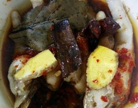 十五分钟后,再向碗里放料酒,香叶,酱油,老姜片,桂皮,蒸鱼油。