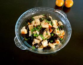 豆腐切成小块,胡萝卜切成小片,豆腐,木耳,豌豆,胡萝卜片分别焯水。