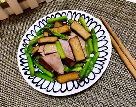 锅热倒油,油热后加蒜片炒香,再放入芦笋,炒一分钟