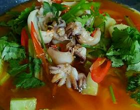 - 5. 食用油加热,加入鲜椒酱、姜片、蒜片、葱段、花椒、小米椒、红海椒,炒香。加入墨鱼仔,料酒翻炒。再加适量鲜汤(或开水),加黄瓜条、芹菜,加盐、鸡精。煮2分钟后加小葱花,起锅。