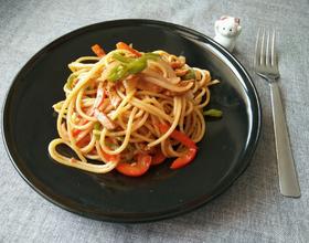 青椒红椒洋葱切丝。鸡肉切丝后用料酒黑胡椒粉腌制。番茄剁碎。
