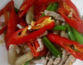 炒至焦黄后,再向锅放芹菜筋段,红尖椒片,爆炒五分钟。