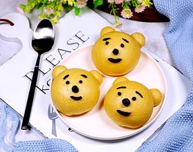 把另外两个小的放在上面做耳朵,把黑可可粉面团取少许拧成条做表情鼻子,眼晴嘴巴和眉毛。