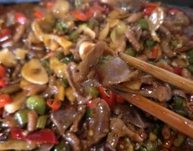 - 4. 放鸡杂炒变色时关火。放鸡精,味精,白糖,十三香,拌匀装盘。