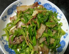 热锅冷油,油稍稍冒烟后放入花椒,生姜和大蒜炒出香味放猪头肉,猪头肉炒起卷后放道锅的一边,再放入青椒,青椒炒几下放少许盐,盐不要多了,因为猪头肉是卤了的是咸的,之后在在肉和青椒混合炒几下,放入鸡精调味。