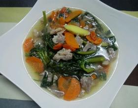 注意:做上汤的时候,肉片要稍微煮出味道来,人参菜叶不要煮太久,滚熟就好,不然会发黄,太烂不好吃;另外,此上汤还可以变化成皮蛋,草菇,肉片,枸子……菜类还可以选新鲜的枸杞子叶,豆苗也不错哦!