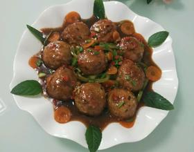 肉圆炸至金黄,起锅,油倒出点,锅底留油,放入大蒜末,胡萝卜片,绿椒圈,红椒粒炒匀,加一点点水,六月鲜白酱油,老抽一点点,醋,糖,放入肉圆,一起大火烧开,烧一会会,放入味精,肉圆起锅装盆,锅内烫汁勾薄芡,淋在肉圆上就OK啦!