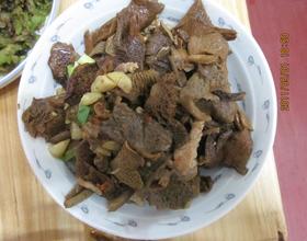 我们家不太喜欢吃太多油的,好油的MM们可以多放些油。入五花肉煸出油炒香,加了大蒜籽爆一下,再加入瘦肉、野干菌翻炒后,加入大蒜叶、食盐、鸡精,酱油,一丁点水大火翻炒后起锅(因为野干菌偏寒性,体寒的MM可以加点胡椒粉)