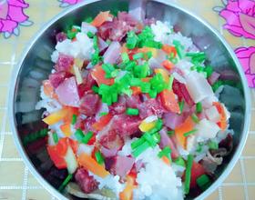 腊肉香肠切丁备用,注意腊肉必须要有肥肉瘦肉混合才好吃,光瘦肉没得油水不好吃,
