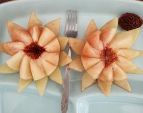 切好后轻轻掰成两半,在每个对角缝隙处做切口,从上到下,不要切的太深,否则花瓣容易断开,也不要切到边缘