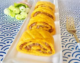 在面片上均匀的抹上肉馅,四周留出一个边方便卷起;
