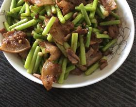 然后倒蒜苔入锅,大火炒至5-10分钟左右,提前放盐,鸡精和生抽,最后起锅装盘