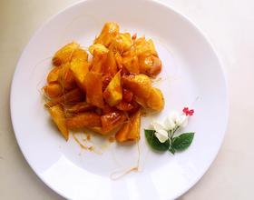 然后微黄,变成小泡,就可以了,拔丝的时候用勺子留一些,再把红薯放进锅里翻几下,然后先把锅里的红薯装盘,在把勺子翻过来,勺子里的拔丝会慢慢留下来,表面就有拔丝了