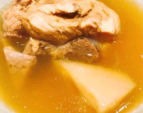 加入腔骨、莲藕、姜、葱、花椒煮开,改小火一个小时