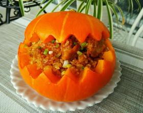 南瓜熟了,就可以取出来,撒上一些葱花装饰一下。