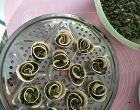 把陷做好,根据自己洗好添加,然后取四张皮铺开,往上面放拌好的陷。