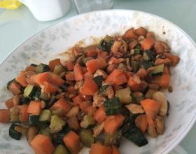 将炒熟的肉放入胡萝卜丁和黄瓜丁