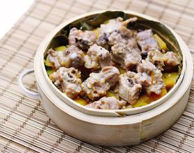 将排骨用蚝油、生姜、大蒜、豆豉、灯笼椒、生粉腌制后,整齐的平铺在南瓜上。