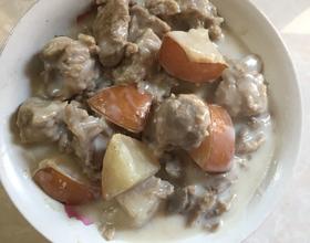 - 8. 将排骨肉和雪梨放入锅中,加入食材一半量的汤。