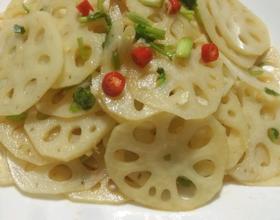 放入醋、切好的辣椒断、香菜、鸡精、盐、葱断、香油、白糖、放入藕片调拌均匀