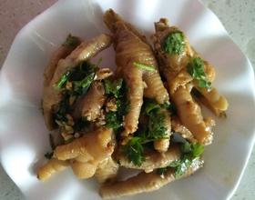 - 14. 用白糖,生抽,香油,醋,麻油调料,连同香菜,蒜末一起加入鸡爪中