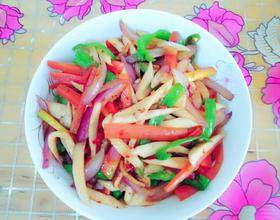 再把杏鲍菇倒进去一起翻炒加盐、味极鲜炒均匀,放味精起锅