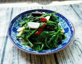 小贴士:空心菜非常容易熟,炒的过程不要久了,开大火翻炒一两分钟就可以了,炒久了很容易就变色了!