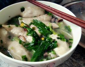 - 7. 这种包法快速,待下锅。胡椒擂碎放锅里煮开,放入适量盐,倒入适量花生油,大火煮开后饺子下锅,煮到饺子皮变色大概三四分钟(水不能太少适量即可)最后丢些洗好的生菜,盐须同葱花,关火,起捞。