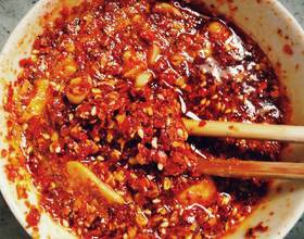 将辣椒面,芝麻,蒜泥经营的混合在一起。