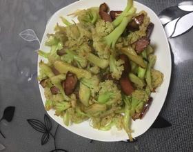 腊肉炒变色加入焯水的花菜,进行翻炒,因菜花中有水分,会有油迸溅出来