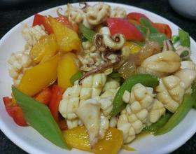 彩椒5分熟,就可以放鱿鱼同炒了