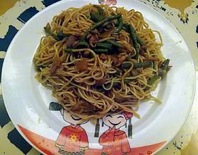 - 3. 热锅凉油,油热后放入肉丝翻炒,加入洋葱和豆角,一遍翻炒一边加入调味料,加入适量凉水,大火煮开,翻炒收汁,根据个人喜好决定汤汁余下多少。