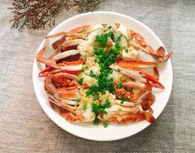 螃蟹背朝下放,煮的时候,不容易掉蟹脚,用热油淋葱花,生姜末蒜泥都放葱下面,浇热油的时候容易出香味