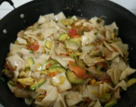 - 13. 起锅烧水,水开后揪面片,先将面赶薄,切成五㎝宽的条状