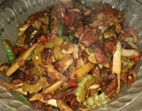 把苦瓜和仔姜水分撇先放苦瓜炒一分钟再放仔姜青椒炒匀,最后放小米辣