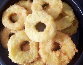 炸的时候往油里扔一点点面包糠 如果面包糠瞬间飘上来了就说明油温刚刚好 苹果圈刚放锅里的时候不要急着马上动 以免糊糊脱落