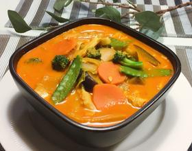 - 4. 锅加橄榄油烧热,炒香蔬菜咖喱粉然后加椰浆和牛奶烧开。