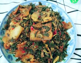 等水分烧干时就在肉放进去在一起翻炒,加味精调味即可