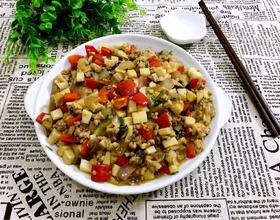 猪肉末炒至发白后,放入杏鲍菇丁和香菇丁翻炒均匀