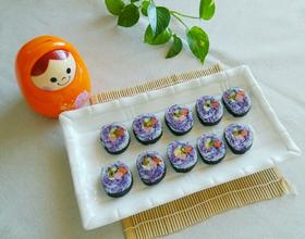 用保鲜膜铺垫,卷帘不会被粘到饭粒,干净。铺米饭时,最后那边少放一点,不然卷到最后,米饭会出来,影响美观。食材根据个人喜好随意。如果叫寿司,应该加入寿司醋的,因为我用了紫薯,为了突出原味,就没有加寿司醋,这样就是紫菜包饭了。