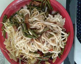新疆拌面的,最大的特点就是在于面,嗯,但是这个面一般人活不好的话,就会拉不成形,可能就是会断,,没有弹性,所以说我就买的面,不容易拉坏,还有就是这个面一定要用大盘子装才有特色,因为新疆的,特色就是大盘,比如大盘鸡,大盘的拌面,各种大盘,所以说大盘子才能体现出新疆的特色。嗯那个,炒菜的时候一定要多加一点水,那样子的话炒的菜才会有菜汤,吃拌面的时候菜汤也非常的重要,菜汤拌进去就非常的入味儿,然后面吃着会更筋道一些。