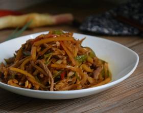 加入仔姜丝和青红椒丝翻炒三四分钟