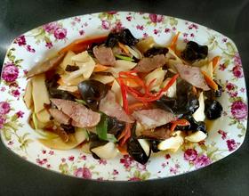 准备好木耳,杏鲍茹,胡罗卜片,红肠切好装盘。