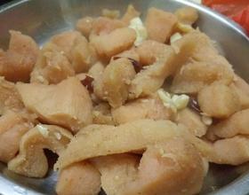- 9. 先放油,把蒜子炒香,倒入柚子皮,再加入辅料一起翻炒,边炒边加水,因水吸引收快,炒时用铲压一下皮,不容易干。