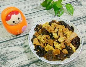 放入肉片,木耳翻炒。加酱油,料酒,醋,白糖,盐,一点点水煸炒。