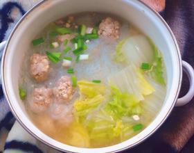 冷水先煮白菜的根茎部分5分钟半熟时候挤豆腐圆子入锅煮至发白
