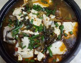 酸菜炒好之后放入水,再把鱼头放入进去熬制
